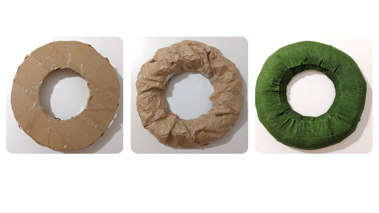 Але оскільки наш віночок із живої ялинки і «прослужить» тільки один сезон, ми робимо просту і дешеву основу з картону і паперу.