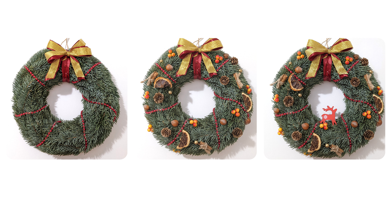 Після цього поступово додаємо декор: його можна розподілити рівномірно або ж дати тільки з одного боку. Насамкінець у нашому варіанті додаємо фінальний акцент – дерев’яне оленятко по центрі віночка.